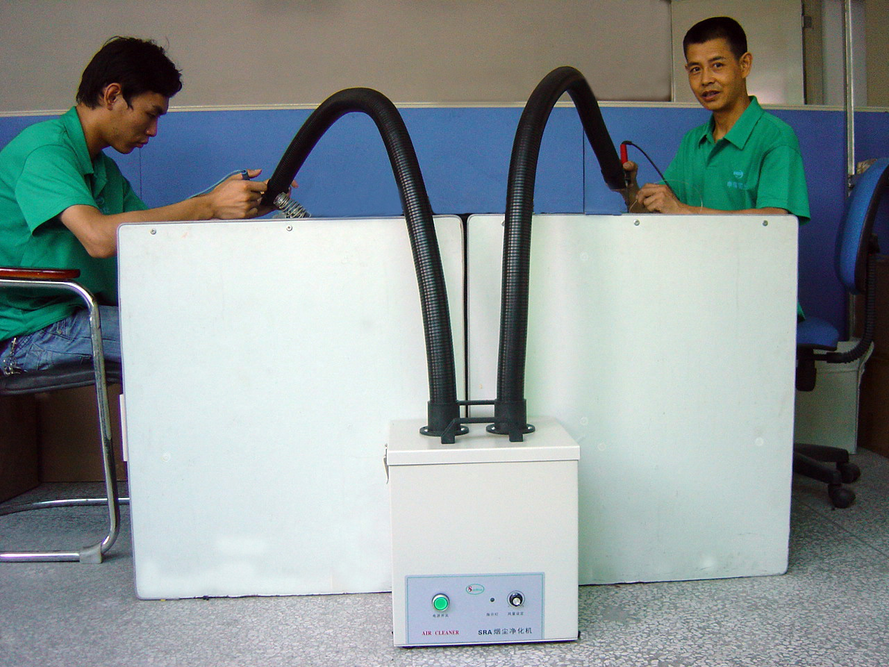 | 大多數(shù)的錫絲屬于無機(jī)化合物是一種低毒產(chǎn)品,短時間內(nèi)接觸是沒有明顯的危害的,但長期接觸,或者錫煙濃度達(dá)到9.362mg/m3時,容易患錫塵肺,而且對神經(jīng)有一定的毒害! 錫煙影響呼吸道初期問題有:正常呼吸有點(diǎn)困難,干咳,但不會影響工作能力。中期:在呼吸上明顯有點(diǎn)困難,影響工作的發(fā)揮。末期:沒有辦法工作。這個時候消化道出現(xiàn)惡性,嘔吐,腹痛,便秘皮膚可出現(xiàn)潰瘍神經(jīng)毒害,早期為精神萎靡,明顯乏力,后期為慢性頭暈,頭痛。 因此在長期接觸錫煙需要注意防護(hù)。SRA焊錫煙霧凈化機(jī),采用點(diǎn)對點(diǎn)凈化,快速、精準(zhǔn)、便捷。萬向吸煙手臂,可隨意拉動固定,無需安裝管道,無需外排,凈化后達(dá)室內(nèi)排放標(biāo)準(zhǔn)。根據(jù)工位安排可以選擇多種安裝方式。 1.單工位焊錫煙霧凈化機(jī),適合零散、少數(shù)工位。