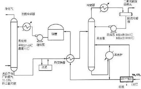 主要工藝原理: 工藝流程主要由三部分組成:以吸收塔為中心,輔以噴水冷卻及增壓設備;以再生塔和再沸器為中心,輔以酸氣冷凝器以及分離器和回流系統;介于以上兩者之間的部分,主要有富酸氣吸收液、再生吸收液換熱及過濾系統。 從爐后經除塵、脫硫后引來的煙氣溫度約為50℃,經設置在CO2捕集裝置吸收塔前的旋流分離裝置將煙氣中的石膏液滴脫除并降塵,然后進入煙氣冷卻器中與循環冷卻水換熱,使其溫度降到~40℃,達到MEA理想吸收溫度,通過氣水分離器除去游離水后經增壓風機加壓后直接進入捕集裝置吸收塔進行CO2吸收[煙霧凈化機]。 設置煙氣預處理系統,脫除煙氣脫硫后攜帶的粉塵、水等雜質對系統的長期穩定運行有利,同時使用抗氧化劑和緩蝕劑,吸收劑消耗低,設備腐蝕小。增壓風機用來克服氣體通過捕集裝置吸收塔時所產生的阻力。 在捕集裝置吸收塔中,煙氣自下向上流動,與從上部入塔吸收液形成逆流接觸,使CO2得到脫除,凈化后煙氣從塔頂排出。由于MEA具有較高的蒸汽壓,為減少MEA蒸汽隨煙氣帶出而造成吸收液損失,通常將吸收塔分成兩段,下段進行酸氣吸收,上段通過水洗,降低煙氣中的MEA蒸汽含量。